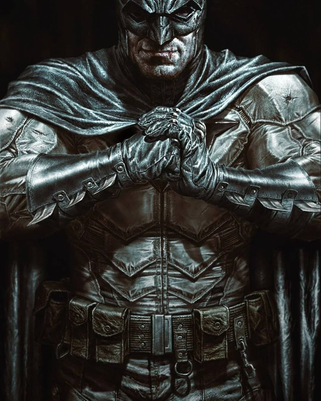 Lee Bermejo獨特的蝙蝠服(在蝙蝠俠/Deathblow和Batman:該死的作品中看到)遠非典型的氨綸外觀。這是純粹的盔甲,功能性和令人困擾,具有哥特式的品質。在羅伯特·帕丁森(Robert Pattinson)的2022年《蝙蝠俠》(The Batman)中,其影響很明顯。